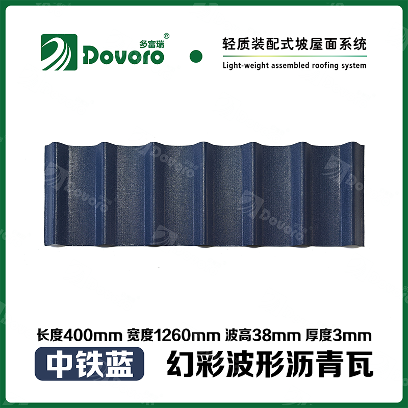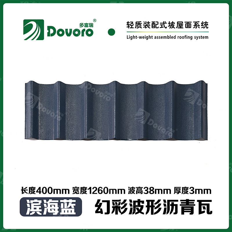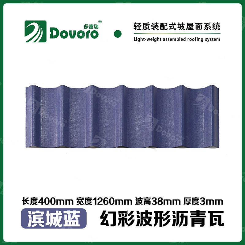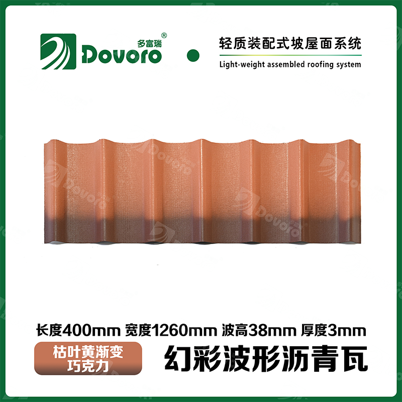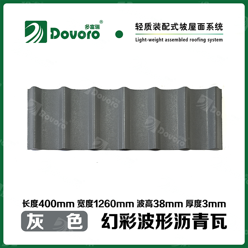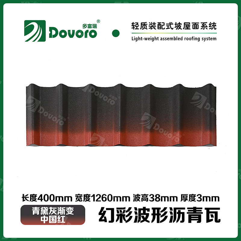 多富瑞幻彩波形瀝青瓦是由礦植物纖維板經(jīng)過整形后浸漬瀝青而成,一次成型的基層板在高溫下浸漬瀝青,使瓦材整體性更加牢固;熱固性樹脂保證了瓦材的強(qiáng)度和剛度;進(jìn)口原料配合先進(jìn)的著色工藝確保顏色持久、混色噴涂工藝使瓦材外觀高雅、色彩美觀、立體質(zhì)感。