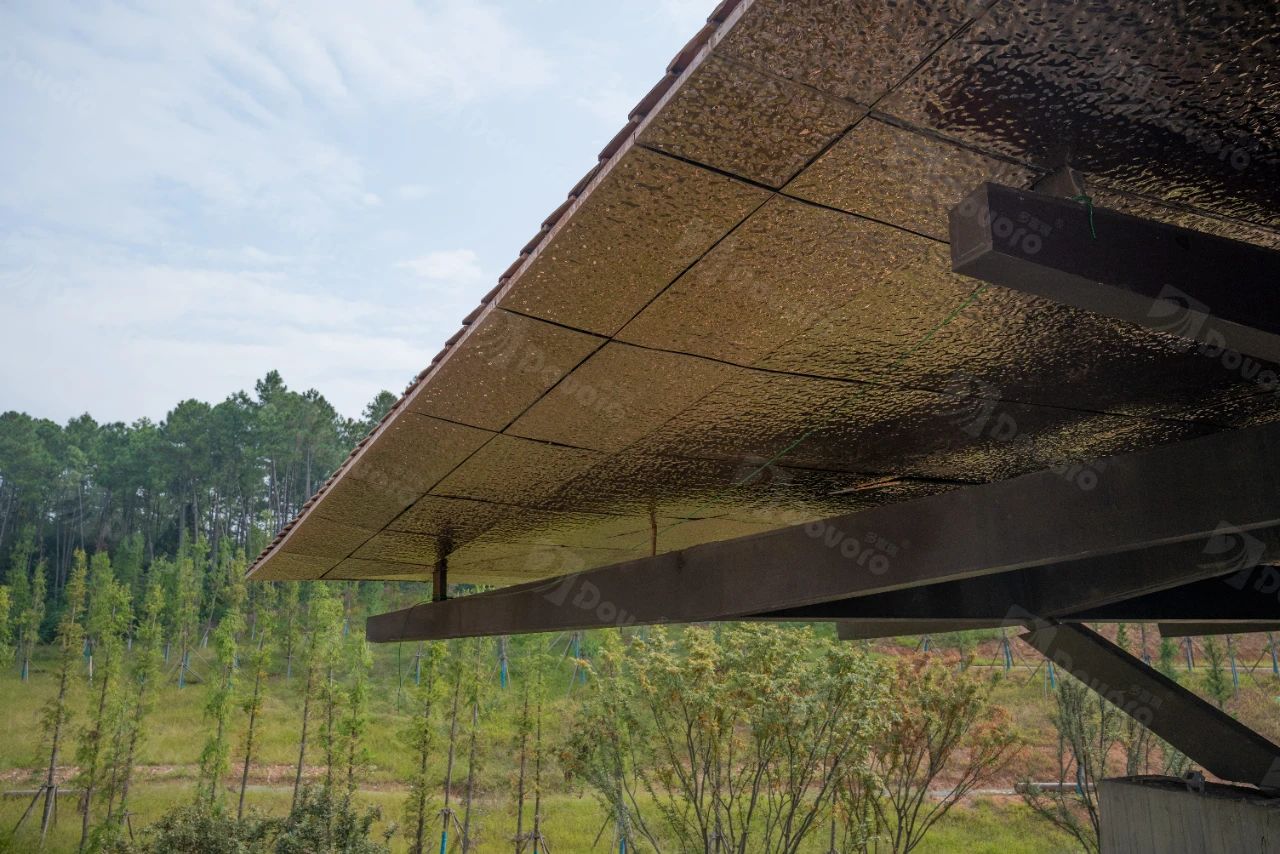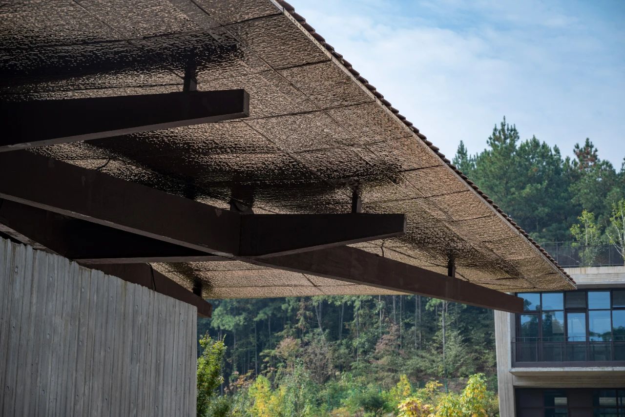景德鎮(zhèn)是世界著名瓷都,作為藝術(shù)氛圍濃厚的特色高校,在景德鎮(zhèn)藝術(shù)職業(yè)大學(xué)的設(shè)計中,就將景德鎮(zhèn)獨(dú)特的地域氣質(zhì)融入和延展在空間之中。屋面設(shè)計還需要考慮到整體風(fēng)格的美感,和傳統(tǒng)文化的表達(dá),最終采用了具有不規(guī)則紋理的陶瓦,搭配波形瀝青防水板進(jìn)行施工。