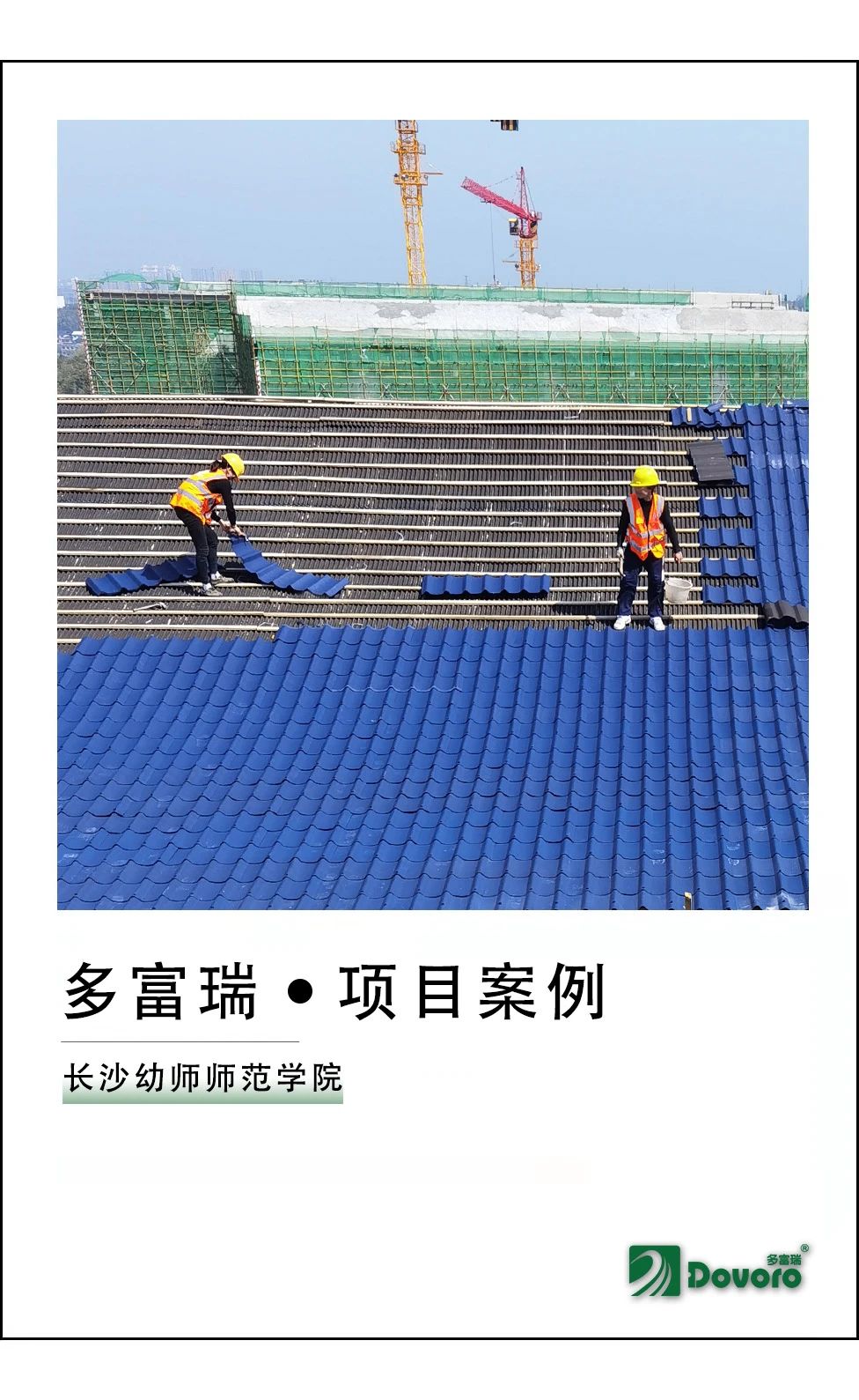 本項(xiàng)目為長沙幼師高等??茖W(xué)院,使用“幻彩”波形瀝青瓦和波形瀝青防水板組合施工,總施工面積約40000平米。