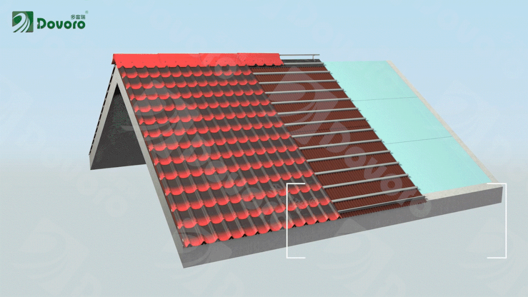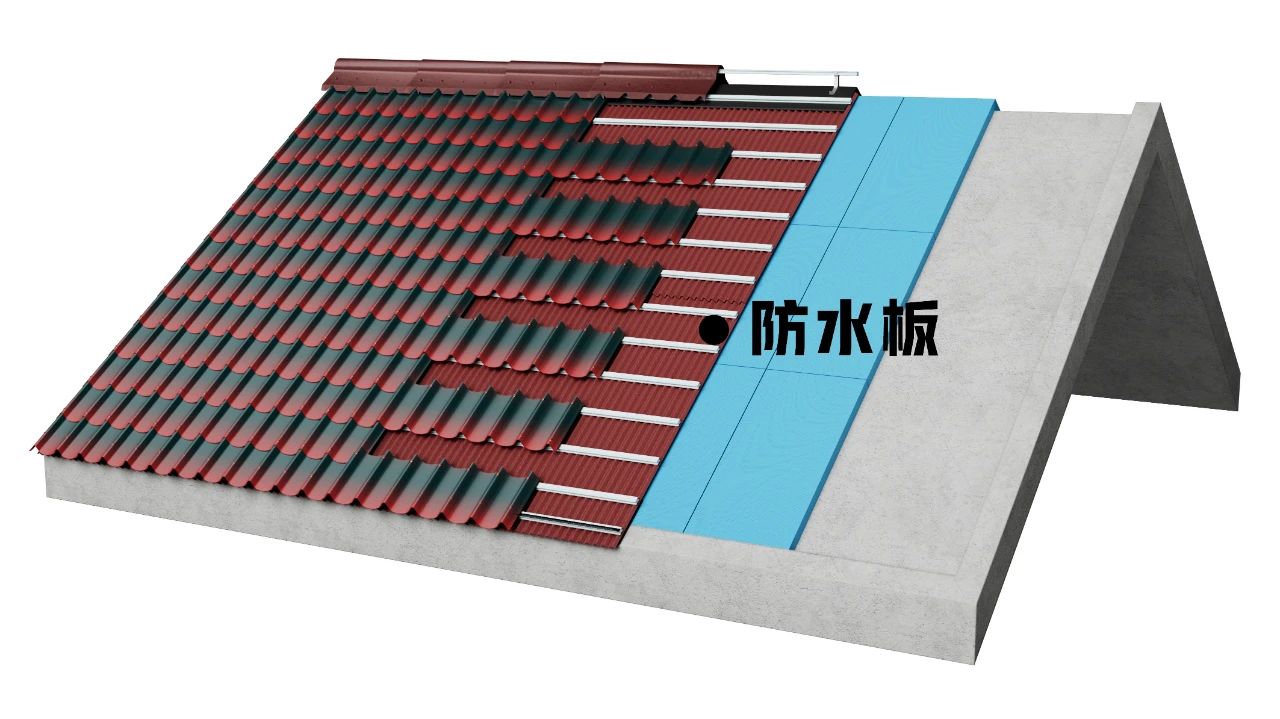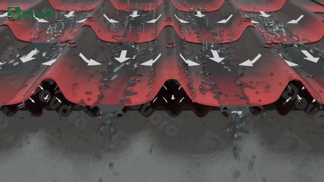 波形瀝青防水板采用了與波形瀝青瓦同樣的防排結(jié)合設(shè)計(jì)。遇到極端降雨天氣,一旦屋面瓦材發(fā)生滲漏,雨水也會(huì)順著波形瀝青防水板從上往下排出屋面,將屋面漏水的概率降至最低。