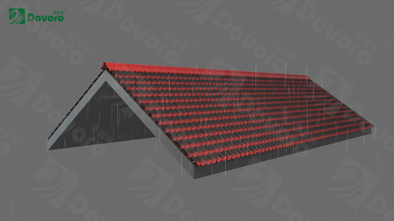 得益于多富瑞輕質(zhì)坡屋面系統(tǒng)的立體構(gòu)造,在上層的波形瀝青瓦與下層的波形瀝青防水板之間,有著每平方米200cm³的通風(fēng)通道。