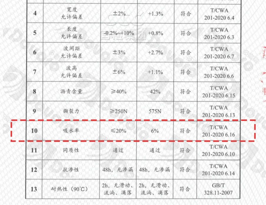 按照T/CWA201-2020《波形瀝青瓦》的標(biāo)準(zhǔn),波形瀝青瓦的吸水率需要≤20%。以“幻影瓦”為例,吸水率僅為6%,遠(yuǎn)低于要求標(biāo)準(zhǔn)。同時(shí)在25次循環(huán)凍融測(cè)試后,性能依舊穩(wěn)定。