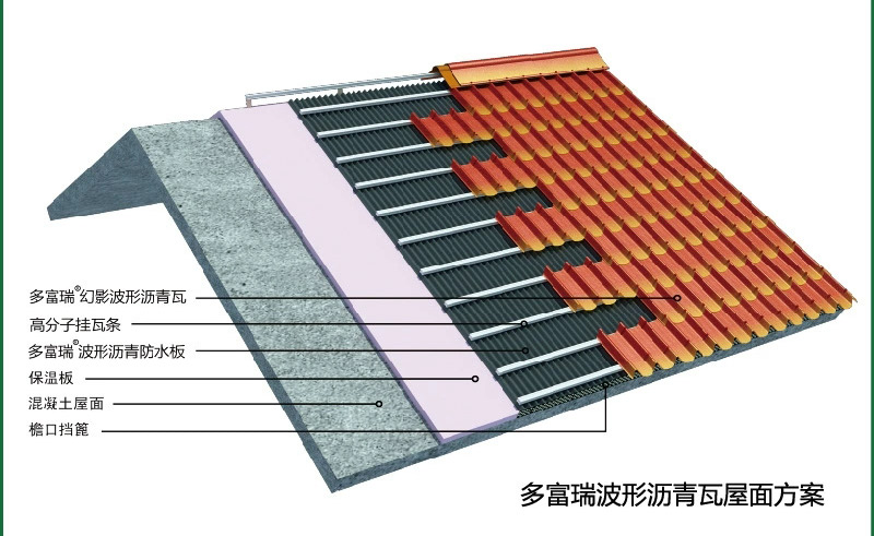 防水板是由植物纖維、礦物纖維和瀝青結(jié)合而成的復(fù)合新型波形防水材料,除自身具備防水性能外,還起到通風(fēng)、除濕等輔助作用,最重要的是在不影響自身性能的前提下把混凝土基層、保溫層和屋面瓦快速有效地整合起來(lái)。